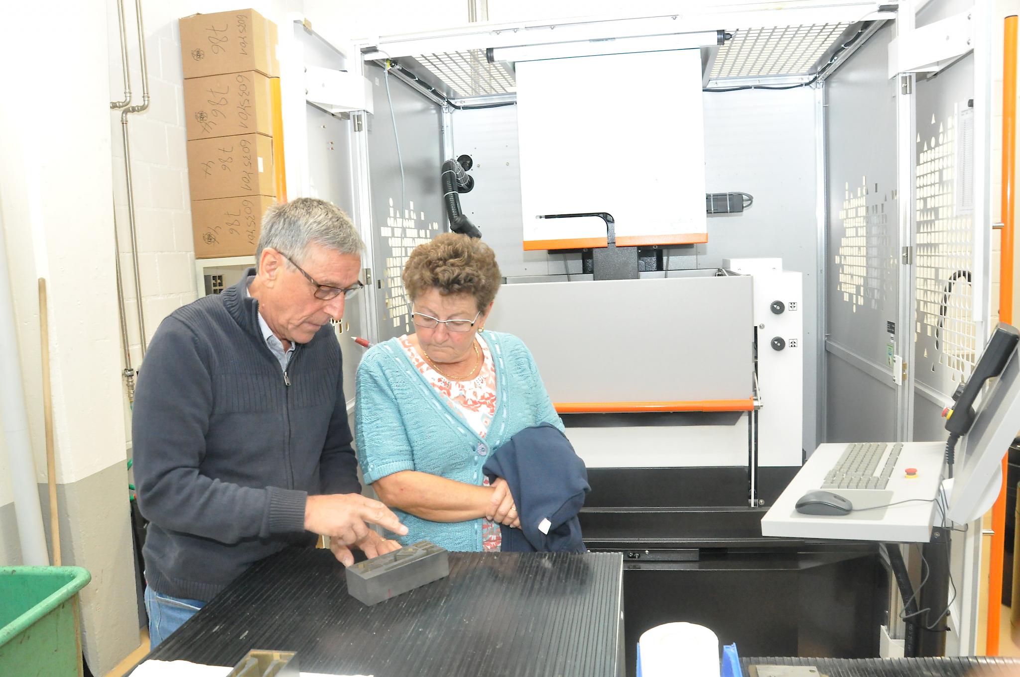 Eingespieltes Team. Dennis Walkusch und Michaela Amstutz beim Schleifen von Stufenbohrern.
