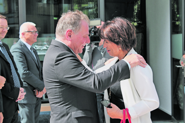 Freude. Philippe Varone, Stadtpräsident von Sitten, gratuliert Silvia Wellig zur Wahl ihres Gatten.