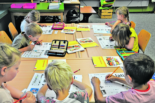 Volles Programm. Bereits am ersten Morgen füllen die Erstklässler ein Arbeitsblatt aus. Zuvor waren nach dem Abgang der Eltern die Verhaltensregeln traktandiert und Leseversuche mit Lehrer Varonier.