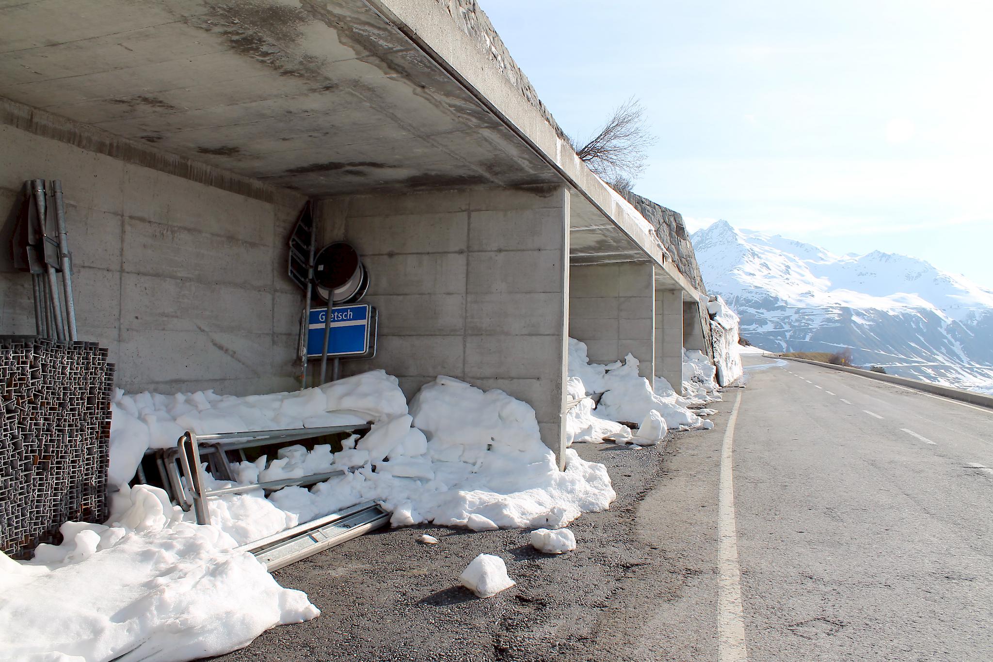 Winterlager. Leitplanken und Signalisationen werden im Herbst jeweils abmontiert, um Schäden durch Lawinen zu vermeiden.