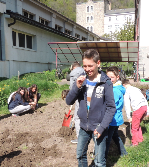 Der Schulgarten wird für das Einsäen bereit gemacht.