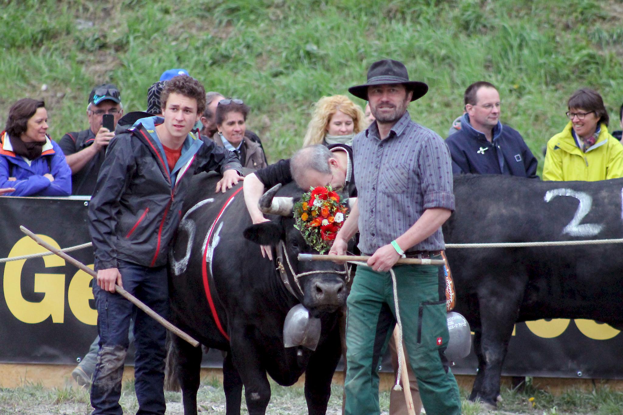 Streicheleinheiten nach gewonnenem Kampf für «Tzigane» von Besitzer Diego Wyssen aus Susten.