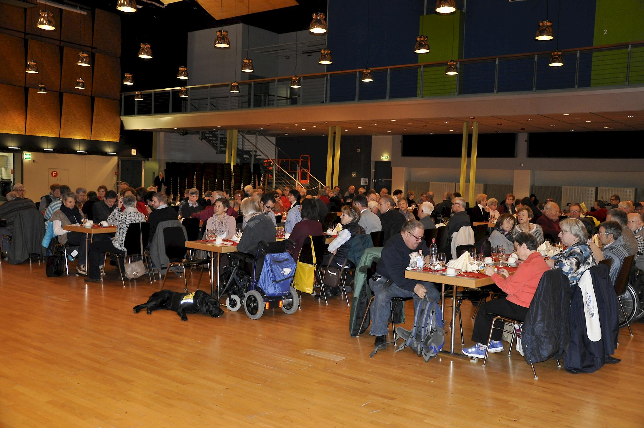 Gäste an der Generalversammlung mit dem Vorstand auf der Bühne im Hintergrund.
