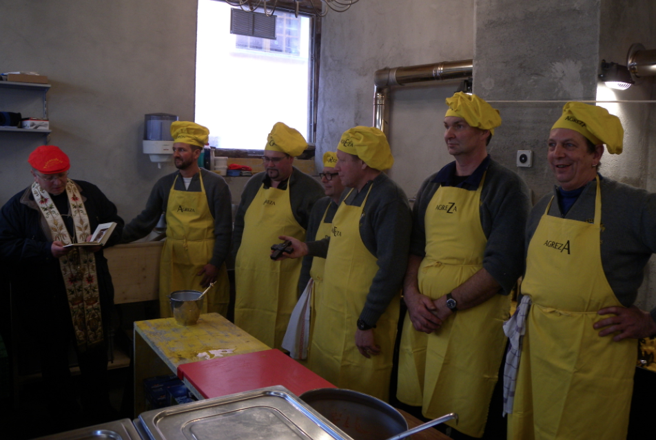Pfarrer Herbert heiss nimmt mit der AGREZA-Mannschaft die Einsegnung der neuen Küche vor.