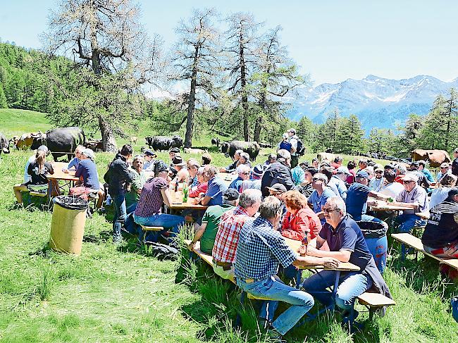 Der Alpaufzug lockte bei strahlendem Sonnenschein auch mehrere Hundert Zuschauer auf die Moosalp, die für reichlich Stimmung sorgten: Es wurde gesungen und gelacht. Während die Rabatteure auf der Wiese alle Hände voll zu tun hatten.