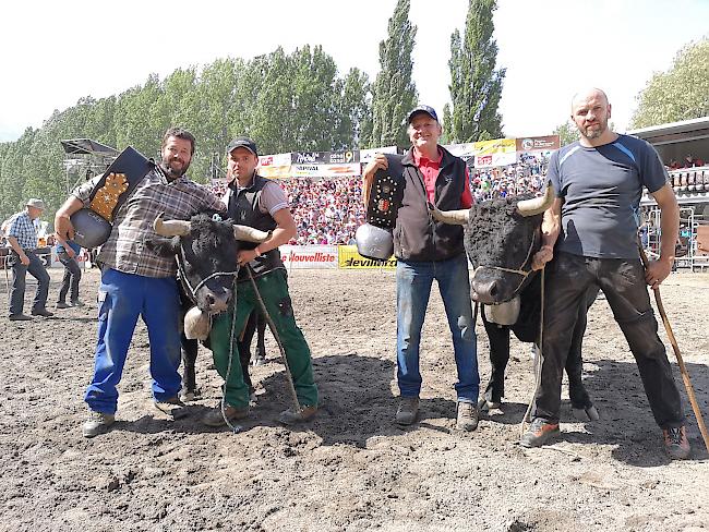 Die Oberwalliser Treichelgewinner in der Kategorie III: «Shakira» von Christian Steiner aus Agarn (links) und «Turbo» von Patrice und Beat Fux aus Törbel.