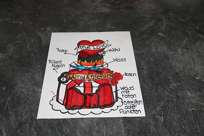 Heute steht eine ausgefallene Hochzeitstorte auf dem Programm. Das Brautpaar feiert im Rockabilly-Look und erhält die Torte im selben Stil geschenkt. «Zusammen mit dem Bruder des Bräutigams habe ich eine Skizze erarbeitet. Er hat mir die Farbauswahl und gewünschte Deko-Elemente beschrieben, daraufhin habe ich die Zeichnung erstellt und letzte kleine Änderungen nach Kundenwunsch vorgenommen.» Für eine klassische Hochzeitstorte benötigtdie Tortendesignerin um die 100 Stunden je nach Grösse und Ausmass und der Deko.