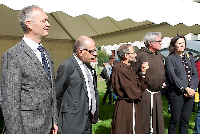 Aufmerksame Zuhörer während der Einsegnung. Emera-VR-Präsident Jean-Pierre Bringhen (v.l), Stadtpräsident Louis Ursprung, Bruder Josef, Bruder Damian und Staatsrätin Esther Waeber-Kalbermatten.