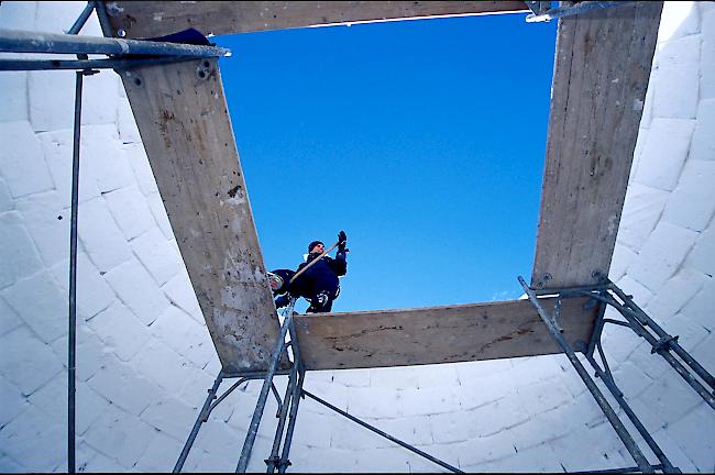Wenn man in frostiger Umgebung arbeitet, hält einem nur eines warm: «Arbeiten», lacht Günter. «Auf keinen Fall herumstehen! Das merkt man schnell, wenn man beispielsweise am Ausmessen ist und sich die Kälte durch die Kleider frisst. Sobald man wieder Blöcke stapelt, bekommt man wieder etwas wärmer.» Und trotzdem: Gerade in den Nächten ist die Stapelei besonders hart, gibt der Bauleiter unumwunden zu. «Aber wir sind auf gutem Weg und können den Terminplan einhalten: Das Iglu wird am 24. Januar fertig sein, danach beginnen wir mit dem Innenausbau.».