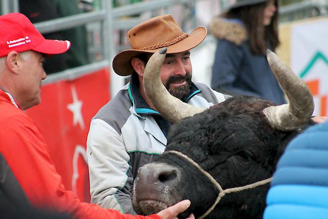 Streicheleinheiten nach gewonnenem Kampf für «Tzigane» von Besitzer Diego Wyssen aus Susten.