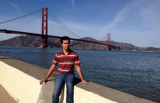 Damian Lötscher vor der Golden Gate Bridge
