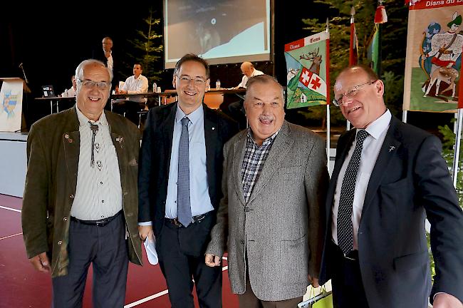 Von links: Alex Schwestermann, Grossrat, Thomas Egger, Nationalrat, Walter Schnyder, 3. an der Hirsch-Trophäenschau, und Jean-Luc Addor, Nationalrat, an der DV des Kantonalen Walliser Jägerverbands.