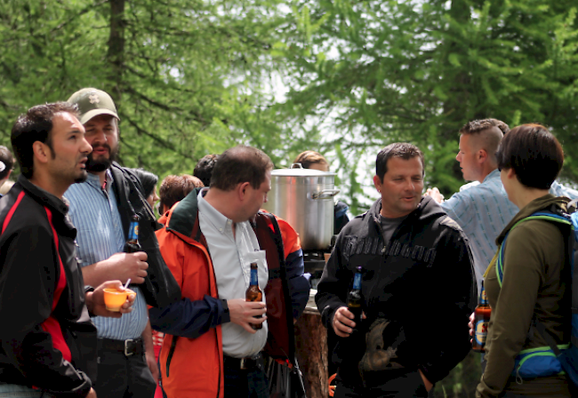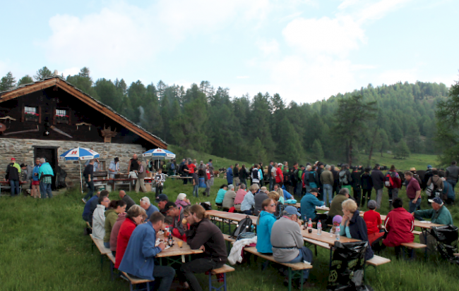 Neben den Kuhkämpfen wird am Alpaufzug auf die Moosalp natürlich das gesellige Zusammensein grossgeschrieben. Dabei sorgten Racletteure und Grillmeister bei lüpfiger Volksmusik dafür, dass die Kehlen nicht trocken und der Bauch nicht leer blieben. Und manch einer der Kuhhalter reichte sein «Buttili» mit Heida für den kleinen Durst zwischendurch in die Runde seiner Züchterkollegen.