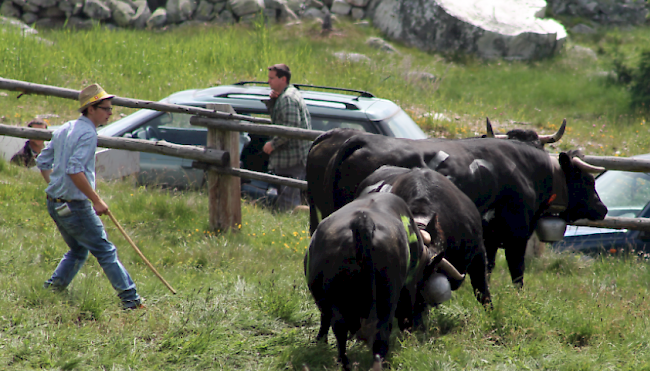 Es ist ein schönes Stück Walliser Tradition, was die zahlreichen Schaulustigen am Samstagvormittag auf der Moosalp erleben durften. Unter der Regie von Alpchef Sepp Karlen wurden etwa rund 140 Kühe von ihren Besitzern auf die malerische Moosalp hochgefahren. Wegen des anhaltend schlechten Frühjahrswetters eine Woche später als geplant.