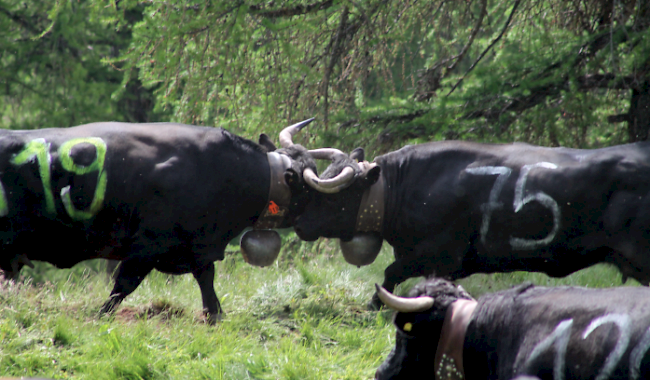 Während sich das hornlose Fleckvieh am saftigen Grün gütlich tat, setzten die kampfeslustigen Eringerkühe ihre Hörner zum Kampf ein. In einem eingezäunten Areal wenig unterhalb der Sennerei auf der Moosalp machten die Kampfkühe ein erstes Mal die Hierarchie untereinander aus. «Während an Stechfesten im Tal am Ende des Tages die Königin feststeht, kristallisiert sich die Alpkönigin erst bis Ende der Sömmerung heraus. Dabei muss sie sich während des Sommers zahlreichen Kämpfen behaupten, um ihre Vormachtstellung zu verteidigen», erklärt Karlen.