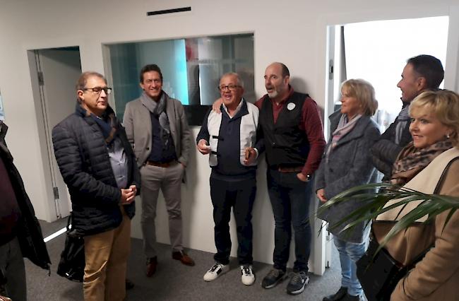 Staatsrätin Esther Waeber-Kalbermatten mit Gatte Reinhard wird vom VR-Präsidenten von mengis media, Nicolas Mengis, durch die Firma geführt.