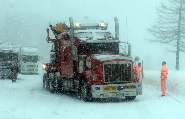 Der plötzliche und heftige Schneefall hat am Montagnachmittag einige Lastwagenfahrer während ihrer Fahrt über den Simplonpass überrascht. Sie mussten auf Ausweichstellen geleitet werden. In einzelnen Fällen wurde dabei vorneweg gesalzen, damit die Fahrzeuge weiterfahren konnten.