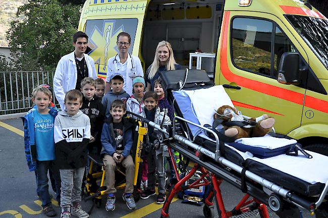 Als erstes durften sich die Kleinen das Ambulanzauto ansehen. Sanitäterin Isabelle Zerzuben erklärte den neugierigen Schülerinnen und Schülern die wichtigsten Aufgaben und Hilfsmittel des täglichen Berufslebens. Im Fokus stand dabei stets ein plüschener Patient, den es zu pflegen galt.
