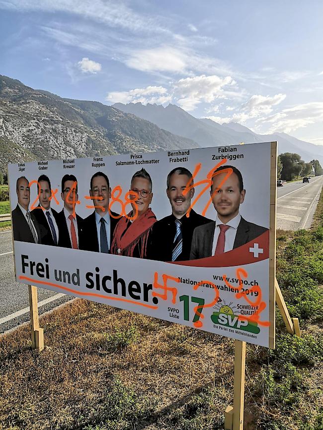 Mindestens drei SVP-Plakate im Bezirk Leuk wurden von Vandalen mit nationalsozialistischen Symbolen beschmiert und beschädigt. Auch die Kampagnen der SVP-Kandidaten Michael Kreuzer und Franz Ruppen sind betroffen.