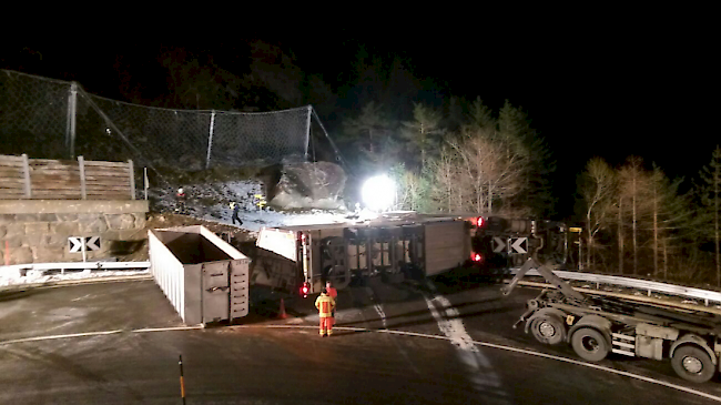 Der Unfall ereignete sich gegen 19 Uhr bei Gondo, wie die Walliser Kantonspolizei am Abend mitteilte. Der Sattelschlepper fuhr vom Simplonpass Richtung Gondo. In einer Kurve bei Ranserma verlor der Lenker die Herrschaft über seinen Lastwagen und kippte am Strassenrand um.