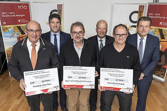 Die Stiftung «100 Jahre Walliser Kantonalbank» hat am Dienstagabend in Sitten Preise im Wert von insgesamt 100000 Franken verliehen. Der gleiche Betrag floss anlässlich des WKB-Jubiläums an humanitäre und soziale Institutionen des Wallis. Der Hauptpreis ging an die Walliser Krebsliga mit Präsident Dr. med. Reinhard Zenhäusern.