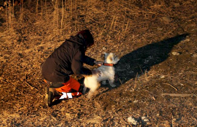 Die Suche nach vermissten Personen wird im Training der REDOG-Regionalgruppe Wallis geübt. Die Hunde erhalten im Anschluss jeweils eine Belohnung.