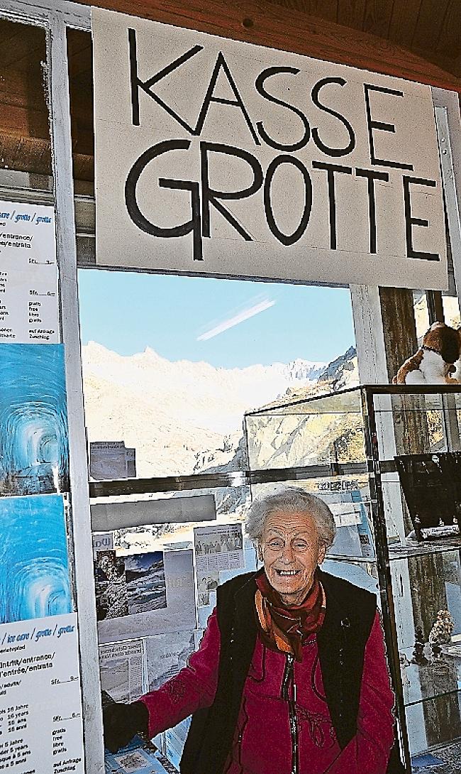 «Die Arbeit hier tut mir gut und hält mich jung», sagt Sophie Harnisch lächelnd. Auch eine kürzlich durchgeführte Hüft-OP kann sie nicht bremsen. Im Dezember feiert sie ihren 89. Geburtstag und steht während der Saison von Ende Mai bis Mitte Oktober noch immer täglich im Basar beim Belvédère, etwa drei Kilometer unterhalb der Furka-Passhöhe. Daneben bedient sie auch die Kasse für die Gletschergrotte. Unzählige Besucher lösten bei ihr die Eintrittstickets für den circa 100 Meter langen Eistunnel, der seit 1870 jedes Jahr wieder neu in den Rhonegletscher geschlagen wird. Nirgends sonst in Europa kann so nahe an einen Gletscher gefahren werden wie zur Eisgrotte im Rhonegletscher. «Die ganze Welt kommt zu uns auf Besuch», sagt Harnisch, um gleich hinzuzufügen,«leider sehr wenige Walliser.» Mit der internationalen Gästeschar hält sie auch mal gerne ein kleines Schwätzchen, auf Deutsch, Französisch, Italienisch oder Englisch. «Besonders die Japaner flippen jeweils aus, wenn ich Ihnen erzähle und zeige, dass man von hier sogar die Spitze des Matterhorns erkennen kann», erzählt Harnisch. Manchmal schweift ihr Blick auch zur Grimsel hinüber: «Wir auf der Furka haben meist das bessere Wetter, dann habe ich ein bisschen Mitleid mit denen da drüben», sagt Harnisch. Viele der Gäste kommen wieder. Nicht wenige sind beim erneuten Besuch erstaunt, ja entsetzt, wie sehr sich der Gletscher im Laufe der Jahre verändert hat, wie stark er seit dem letzten Besuch zurückgegangen ist. Harnisch nimmt dies relativ gelassen: «Ich halte es da mit dem griechischen Philosophen Heraklit, der sagte: Panta rhei – alles fliesst.» Dieses Motto ist auch auf einer Tafel bei der Kasse zu lesen: «Alles fliesst und nichts bleibt. Es gibt kein eigentliches Sein, nur ein ewiges Werden und Wandeln.»